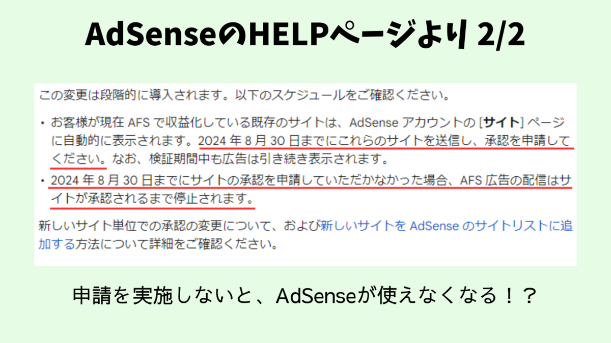 よく読むと、【2024 年 8 月 30 日までにサイトの承認を申請していただかなかった場合、AFS 広告の配信はサイトが承認されるまで停止されます。】との記載が…
